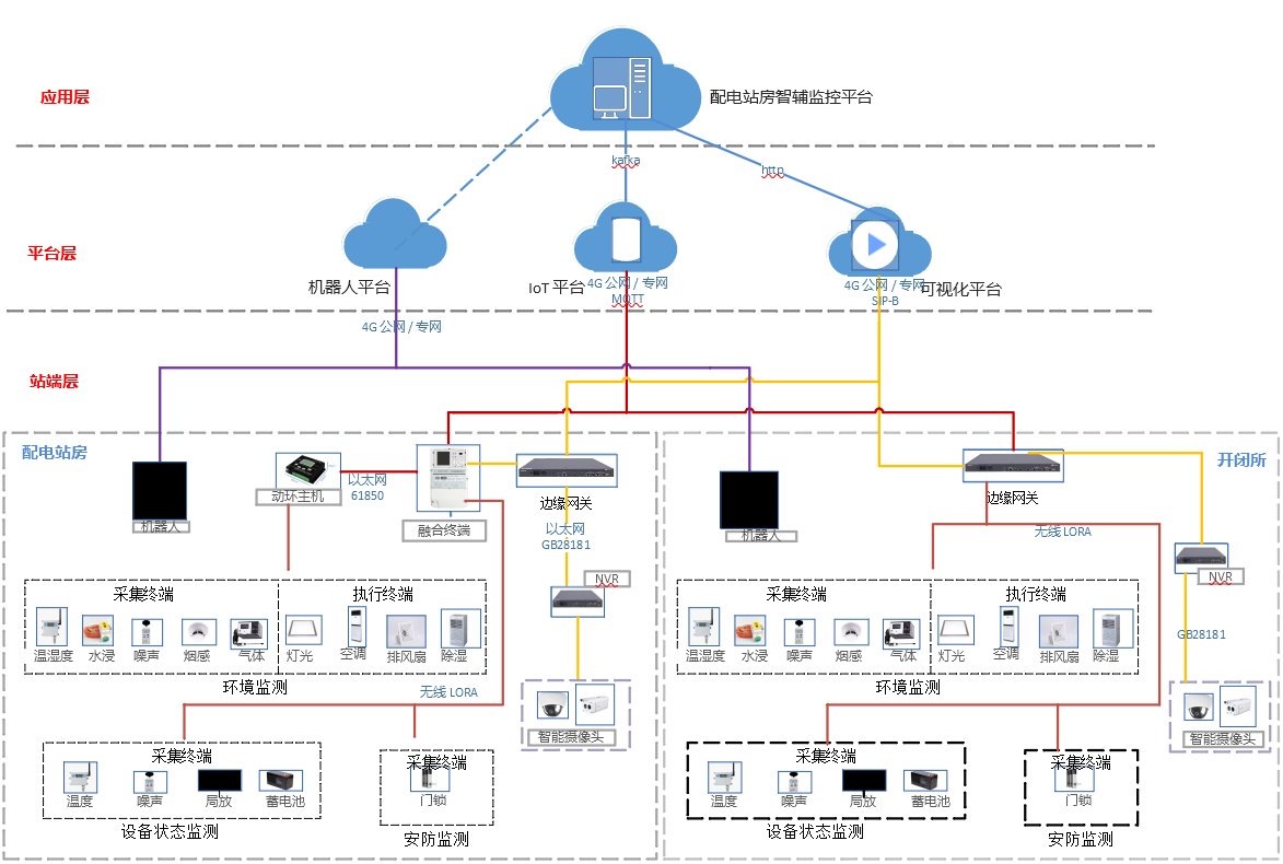 站端监控系统通过融合终端和站房智能辅助与人工智能可视化网关设备进行站内实时数据的采集上送,站房智能辅助与人工智能可视化网关接收站房环境数据信息,同时接收站内设备状态、安防信息、视频监控等监测数据,将监测数据通过通过 4G(APN)方式上送 IoT平台;同时站房智能辅助与人工智能可视化网关将视频监控信息通过 4G(APN)方式上送可视化平台。开闭所等无融合终端的场所,由站房智能辅助与人工智能可视化网关采集站端数