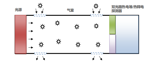 SF6 气体检测单元结构组成包括:一个红外光源、一个气室、两个滤光片和红外探测器组成。