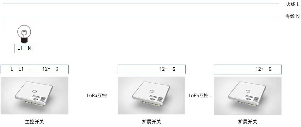 主控开关和扩展开关采用 DC12V 供电,灯光接入主控开关火线控制输出 L1,扩展开关只需保证供